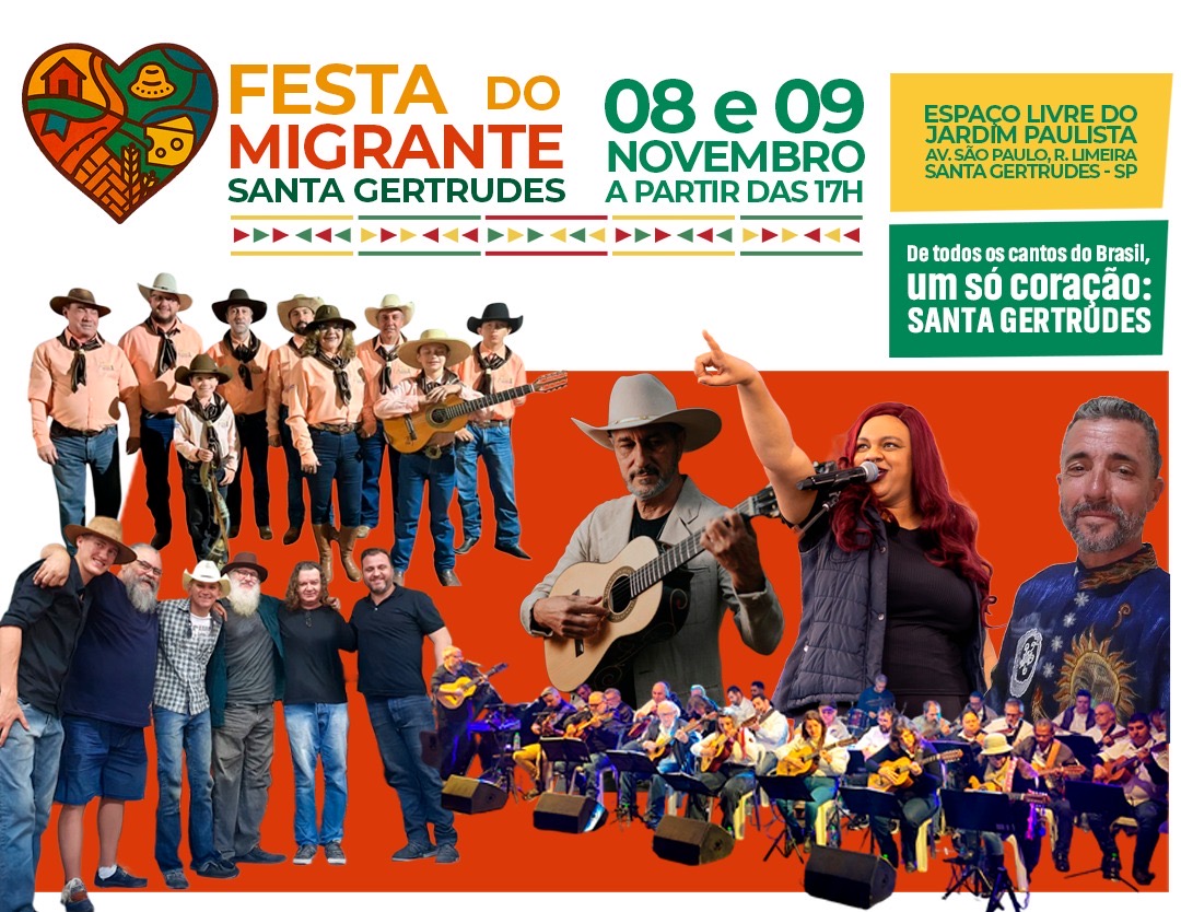O evento será realizado no espaço livre do Jardim Paulista, localizado na Avenida São Paulo com a Rua Limeira, e promete reunir música, dança e gastronomia típica em uma grande homenagem aos migrantes que ajudaram a construir a história de Santa Gertrudes. A entrada é gratuita.