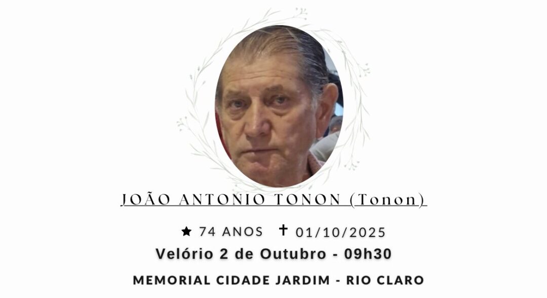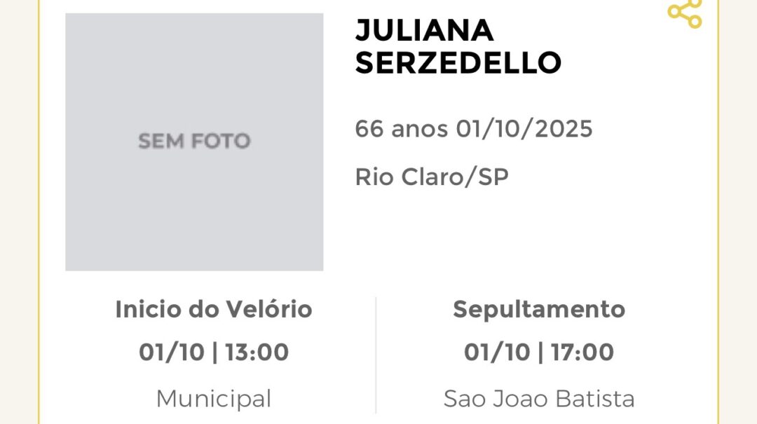 Sepultamento dia 02 as 13:15 hs., saindo o féretro do velório MEMORIAL CIDADE JARDIM, na cidade de Rio Claro para o cemitério SÃO JOÃO BATISTA, na cidade de Rio Claro.