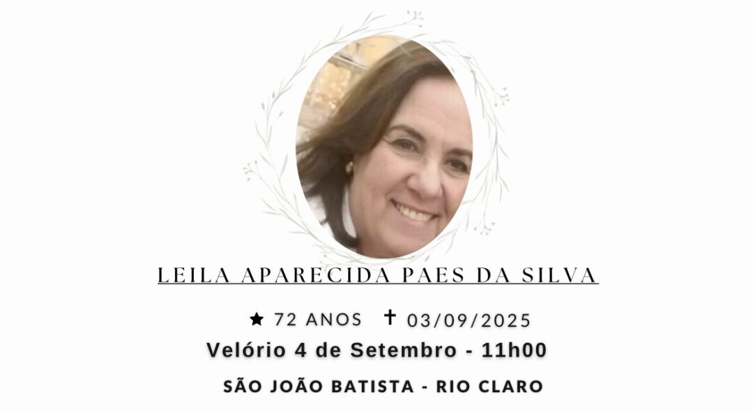Sepultamento dia 03 as 17h00, saindo o féretro do velório MUNICIPAL, na cidade de Rio Claro para o cemitério SÃO JOÃO BATISTA, na cidade de Rio Claro.
