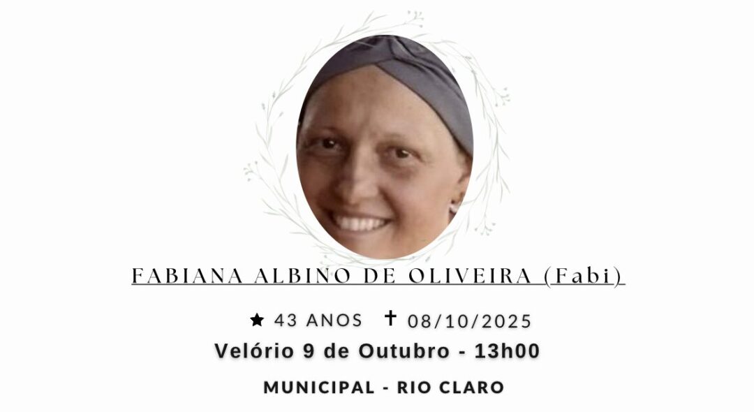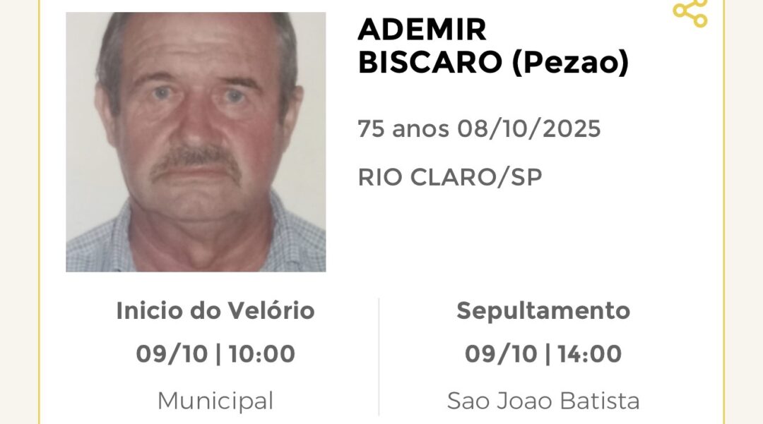 Sepultamento dia 09 as 14:00 hs., saindo o féretro do velório MUNICIPAL, na cidade de Rio Claro para o cemitério SÃO JOÃO BATISTA, na cidade de Rio Claro.