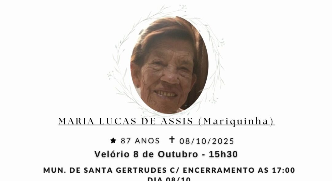 Sepultamento dia 09 as 17:00 hs., saindo o féretro do velório MUN. DE SANTA GERTRUDES, na cidade de Santa Gertrudes para o cemitério MUNI. DE SANTANA DE MANHUACU, na cidade de SANTANA DE MANHUACU.