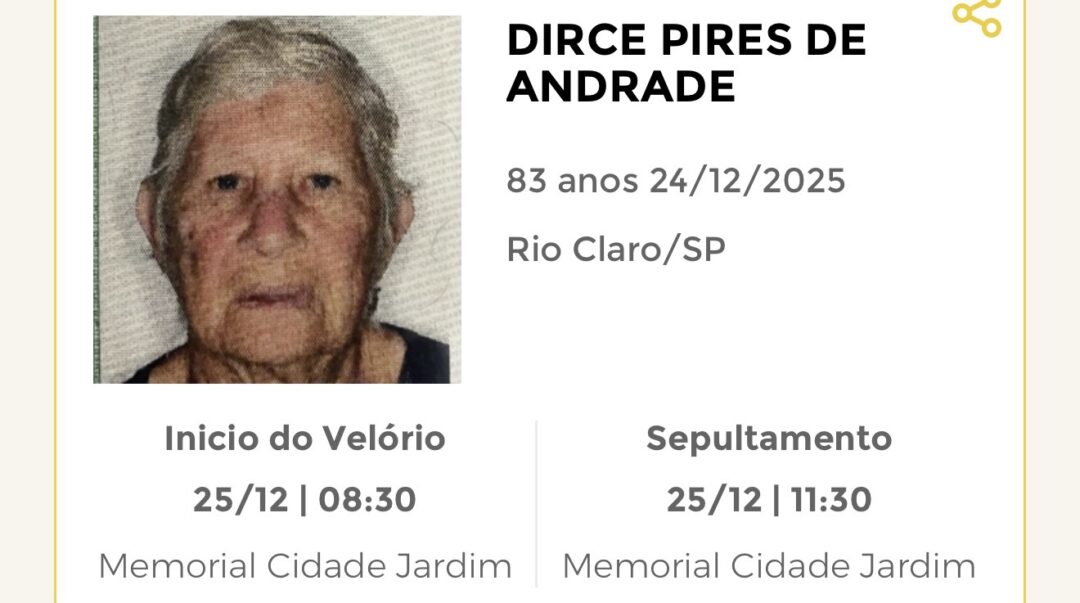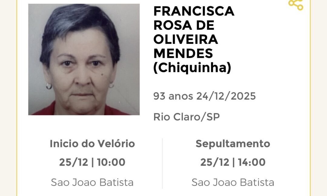 Sepultamento dia 25 as 14:00 hs., saindo o féretro do velório SÃO JOÃO BATISTA, na cidade de Rio Claro para o cemitério SÃO JOÃO BATISTA, na cidade de Rio Claro.