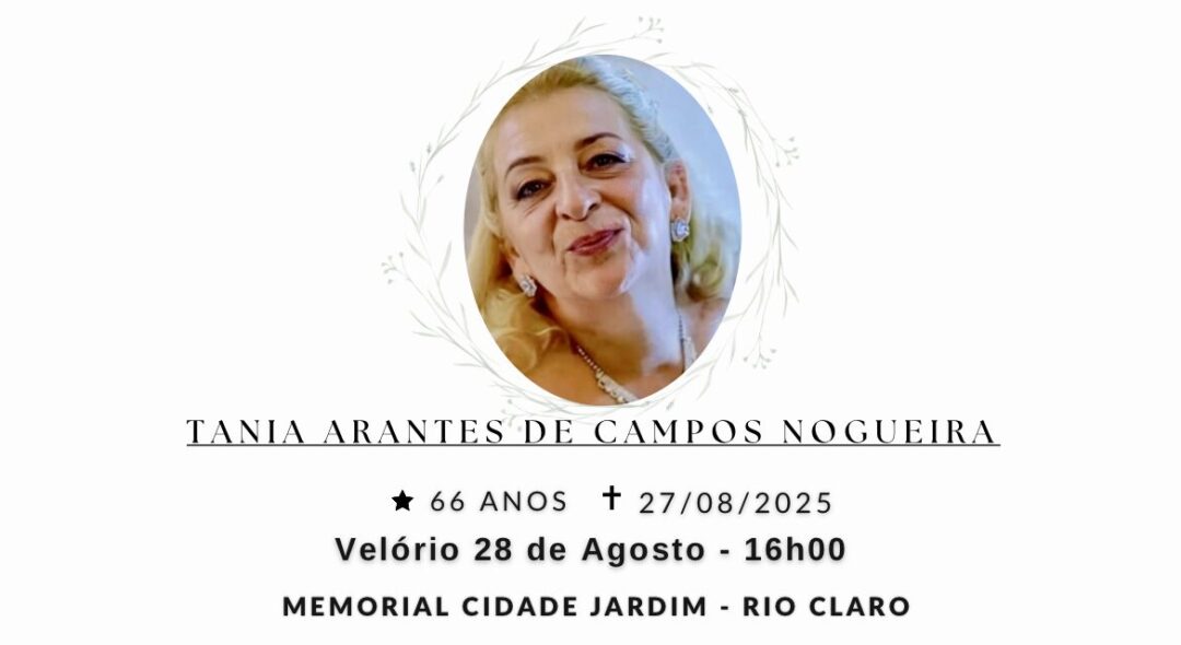 Sepultamento dia 28 as 16h00, saindo o féretro do velório MEMORIAL CIDADE JARDIM, na cidade de Rio Claro para o cemitério CREMATÓRIO MEMORIAL CIDADE JARDIM, na cidade de Rio Claro.
