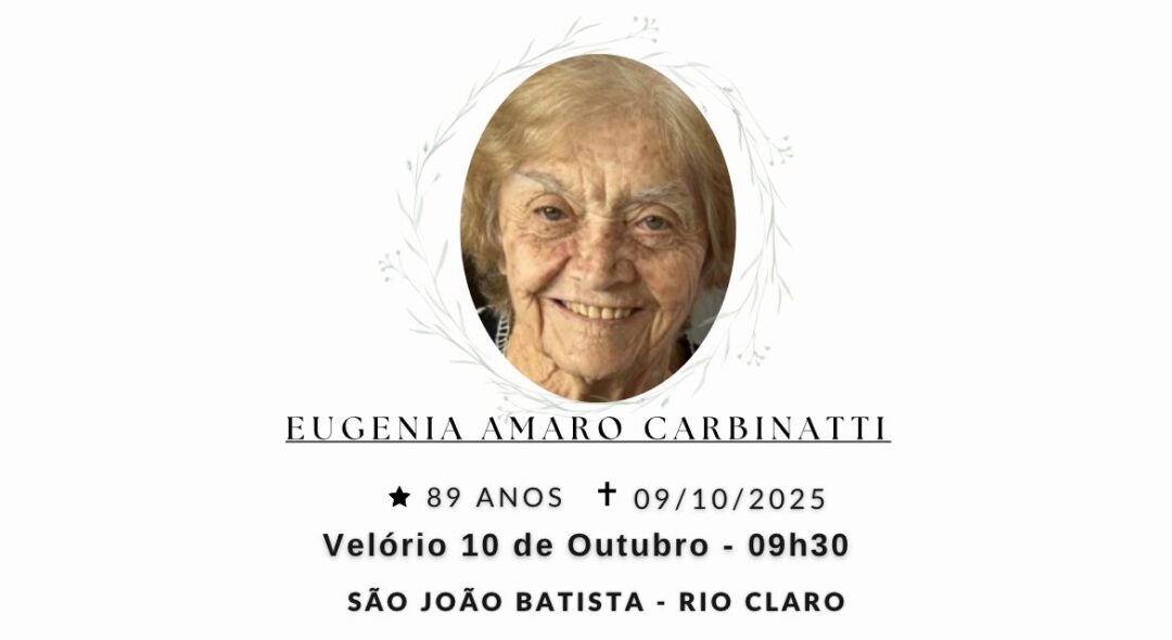 Sepultamento dia 10 as 13:30 hs., saindo o féretro do velório SÃO JOÃO BATISTA, na cidade de Rio Claro para o cemitério SÃO JOÃO BATISTA, na cidade de Rio Claro.