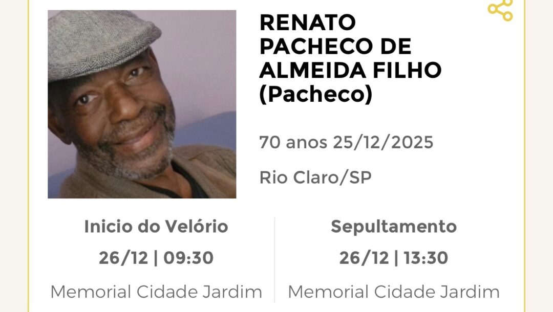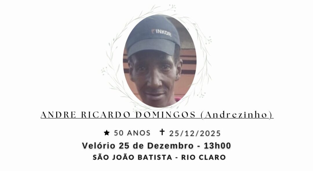 Sepultamento dia 25 as 17:00 hs., saindo o féretro do velório SÃO JOÃO BATISTA, na cidade de Rio Claro para o cemitério SÃO JOÃO BATISTA, na cidade de Rio Claro.