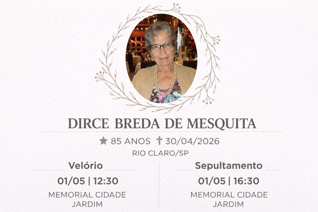 Sepultamento dia 01 as 16:30 hs., saindo o féretro do velório MEMORIAL CIDADE JARDIM, na cidade de Rio Claro para o cemitério MEMORIAL CIDADE JARDIM, na cidade de Rio Claro.