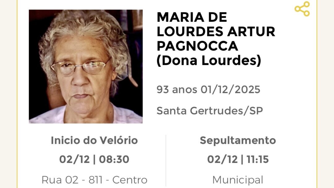Sepultamento dia 02 as 11:15 hs., saindo o féretro do velório RUA 02 – 811 – CENTRO, na cidade de Santa Gertrudes para o cemitério MUNICIPAL, na cidade de Santa Gertrudes.