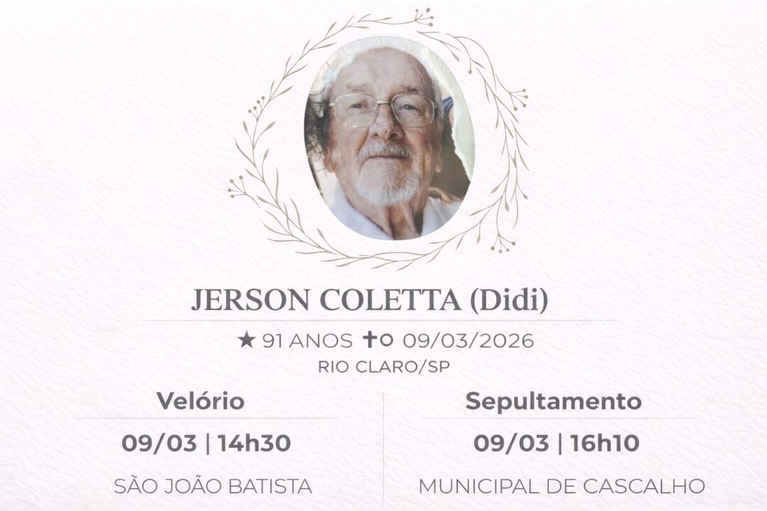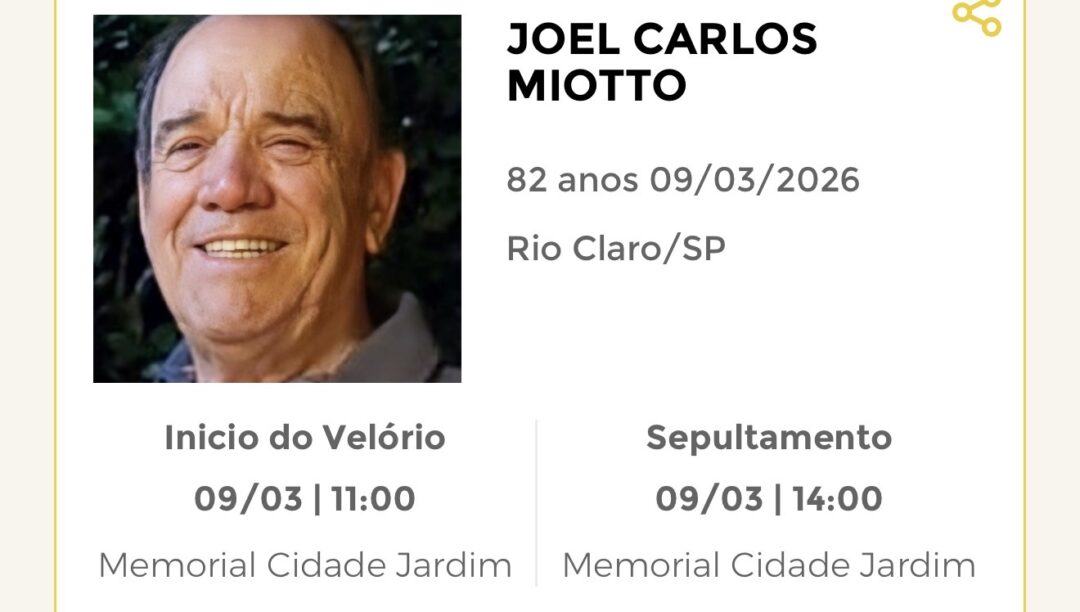 Sepultamento dia 09 as 14:00 hs., saindo o féretro do velório MEMORIAL CIDADE JARDIM, na cidade de Rio Claro para o cemitério MEMORIAL CIDADE JARDIM, na cidade de Rio Claro.