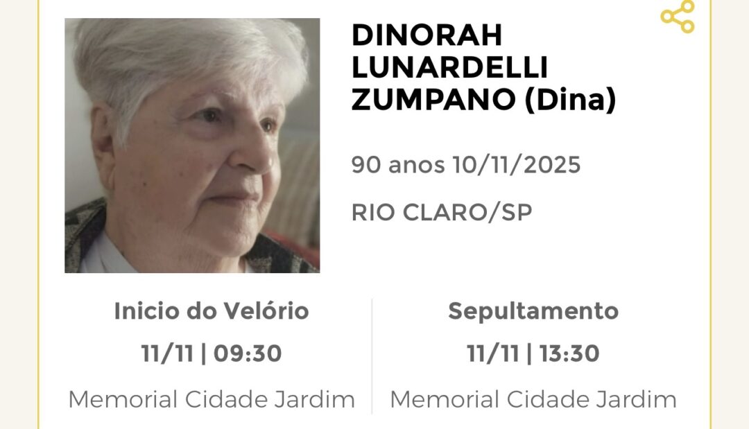 Sepultamento dia 11 as 15:00 hs., saindo o féretro do velório MEMORIAL CIDADE JARDIM, na cidade de Rio Claro para o cemitério MEMORIAL CIDADE JARDIM, na cidade de Rio Claro.