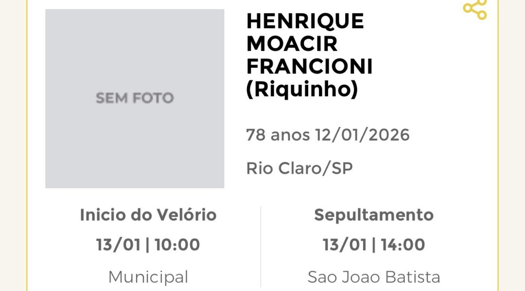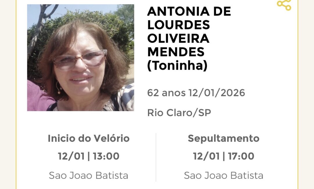 Sepultamento dia 13 as 14:00 hs., saindo o féretro do velório MUNICIPAL, na cidade de Rio Claro para o cemitério SÃO JOÃO BATISTA, na cidade de Rio Claro.