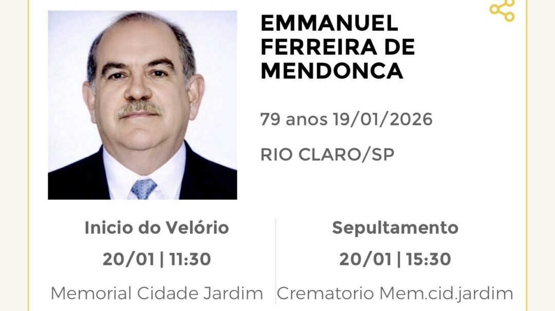 Sepultamento dia 20 as 15:00 hs., saindo o féretro do velório MEMORIAL CIDADE JARDIM, na cidade de Rio Claro para o cemitério MEMORIAL CIDADE JARDIM, na cidade de Rio Claro.