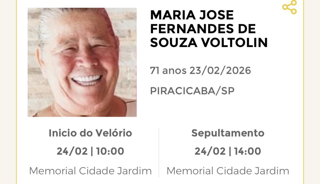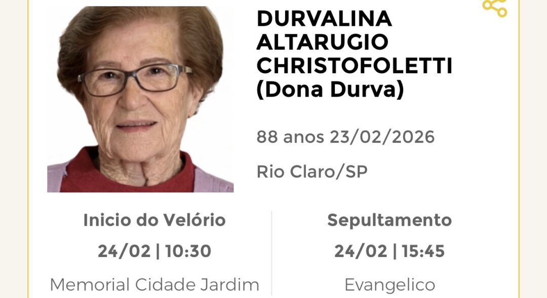 Sepultamento dia 24 as 15:45 hs., saindo o féretro do velório MEMORIAL CIDADE JARDIM, na cidade de Rio Claro para o cemitério EVANGÉLICO, na cidade de Rio Claro.