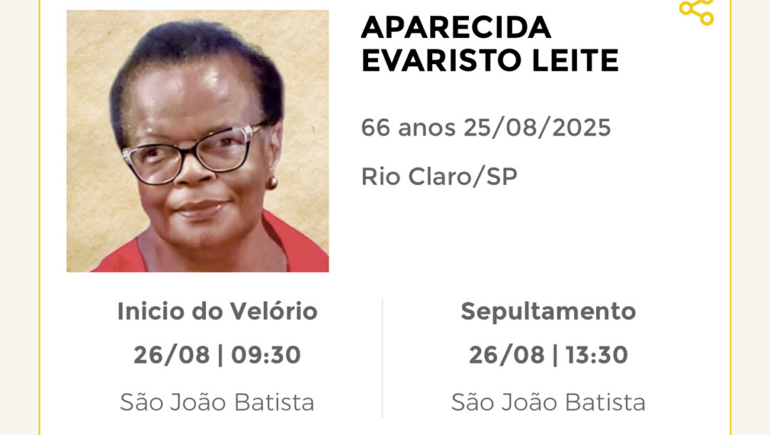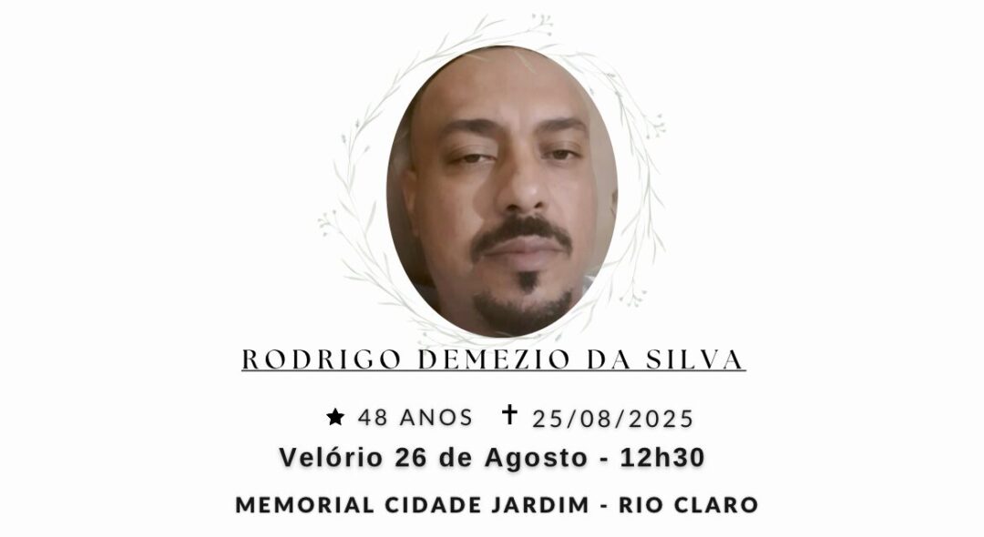 Sepultamento dia 26 as 16h30, saindo o féretro do velório MEMORIAL CIDADE JARDIM, na cidade de Rio Claro para o cemitério MEMORIAL CIDADE JARDIM, na cidade de Rio Claro.