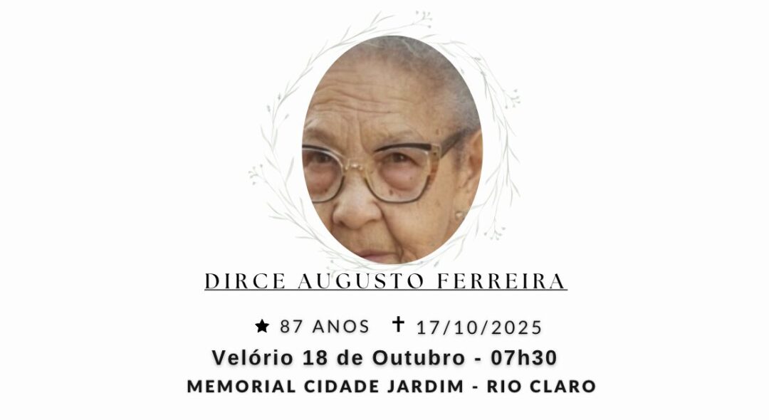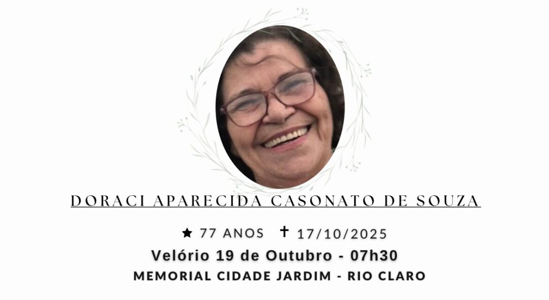 Sepultamento dia 19 as 10:15 hs., saindo o féretro do velório MEMORIAL CIDADE JARDIM, na cidade de Rio Claro para o cemitério SAO JOAO BATISTA, na cidade de Rio Claro.