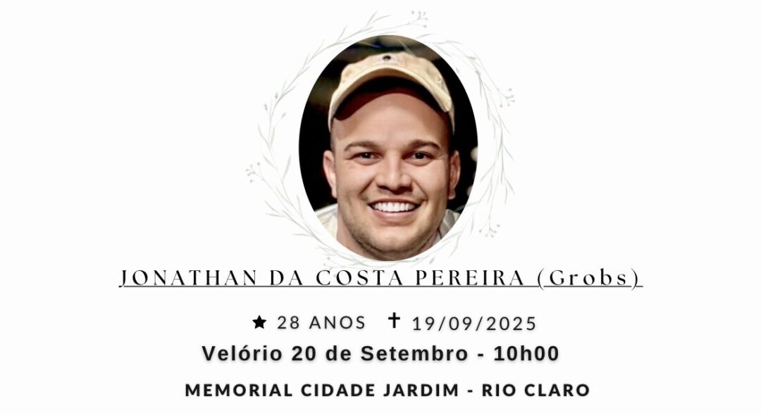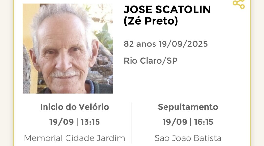 Sepultamento dia 19 as 17:00 hs., saindo o féretro do velório SÃO JOÃO BATISTA, na cidade de Rio Claro para o cemitério SÃO JOÃO BATISTA, na cidade de Rio Claro.