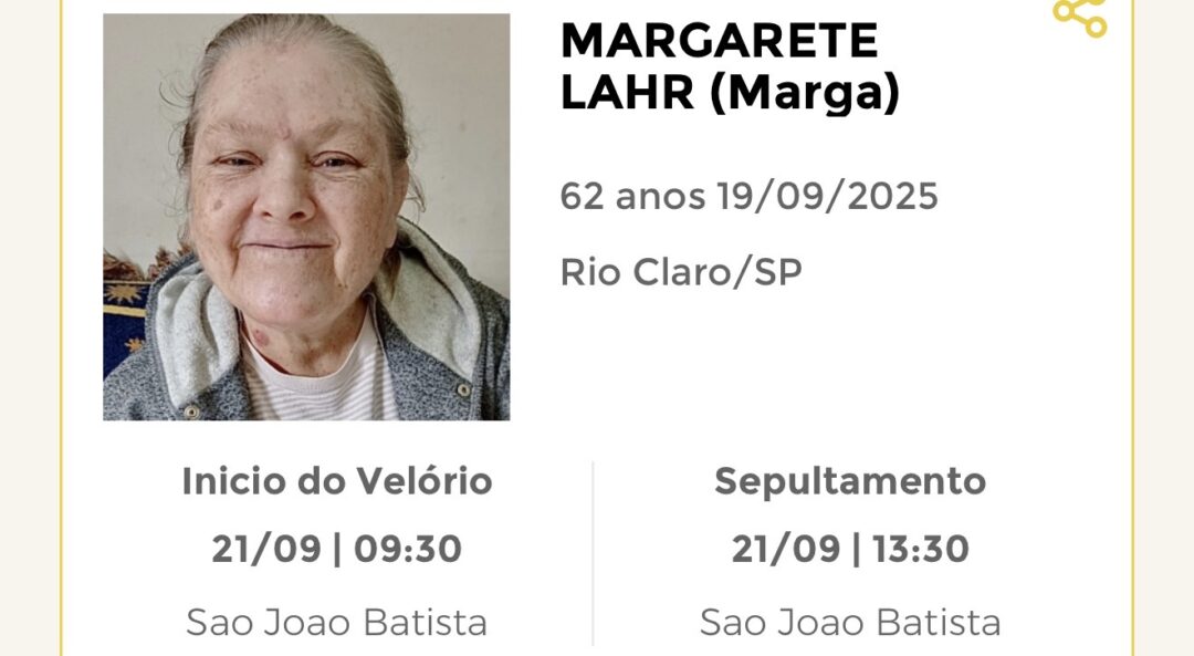 Sepultamento dia 19 as 16:15 hs., saindo o féretro do velório MEMORIAL CIDADE JARDIM, na cidade de Rio Claro para o cemitério SÃO JOÃO BATISTA, na cidade de Rio Claro.