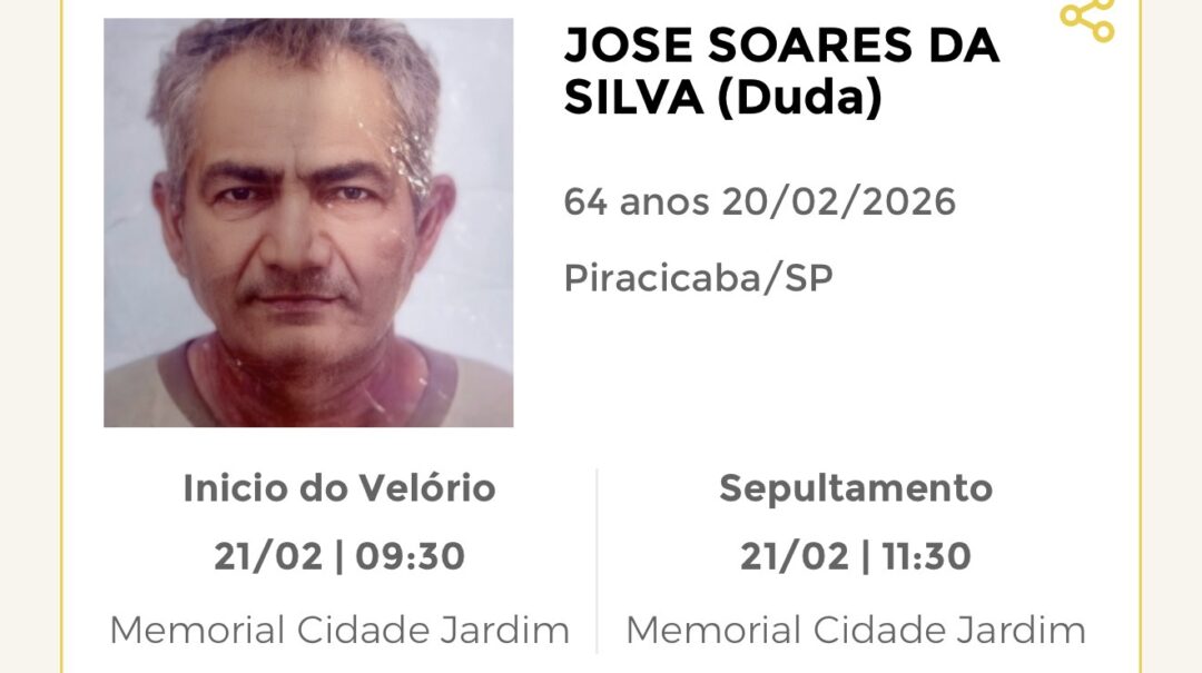 Sepultamento dia 21 as 11:30 hs., saindo o féretro do velório MEMORIAL CIDADE JARDIM, na cidade de Rio Claro para o cemitério MEMORIAL CIDADE JARDIM, na cidade de Rio Claro.