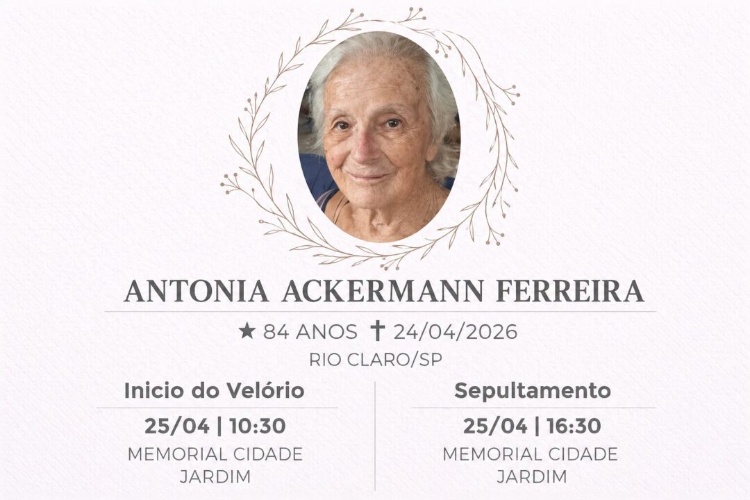 Sepultamento dia 25 as 16:30 hs., saindo o féretro do velório MEMORIAL CIDADE JARDIM, na cidade de Rio Claro para o cemitério MEMORIAL CIDADE JARDIM, na cidade de Rio Claro.