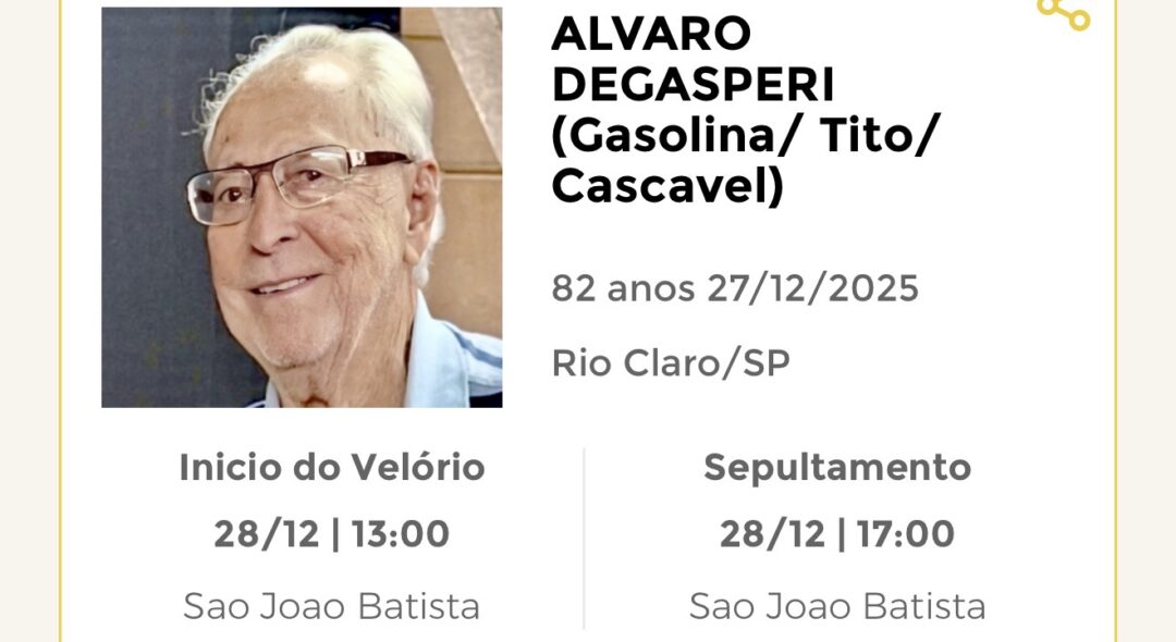 Sepultamento dia 27 as 10:30 hs., saindo o féretro do velório SÃO JOÃO BATISTA, na cidade de Rio Claro para o cemitério SÃO JOÃO BATISTA, na cidade de Rio Claro.