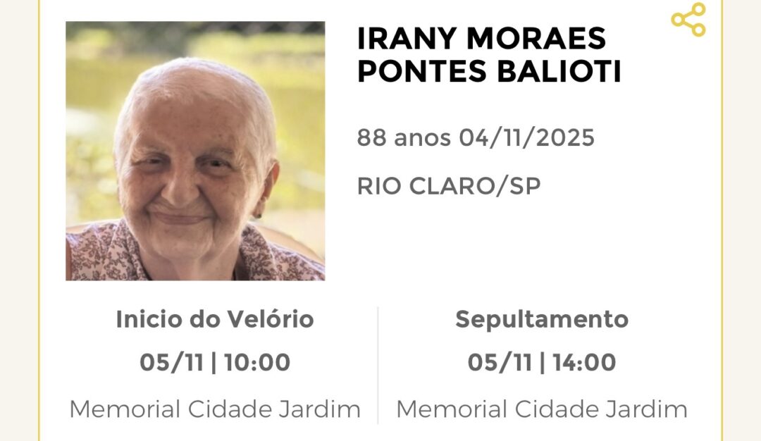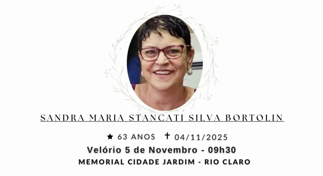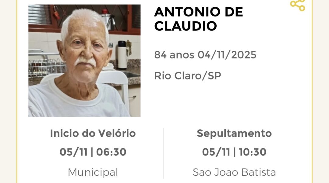 Sepultamento dia 05 as 10:30 hs., saindo o féretro do velório MUNICIPAL, na cidade de Rio Claro para o cemitério SÃO JOÃO BATISTA, na cidade de Rio Claro.