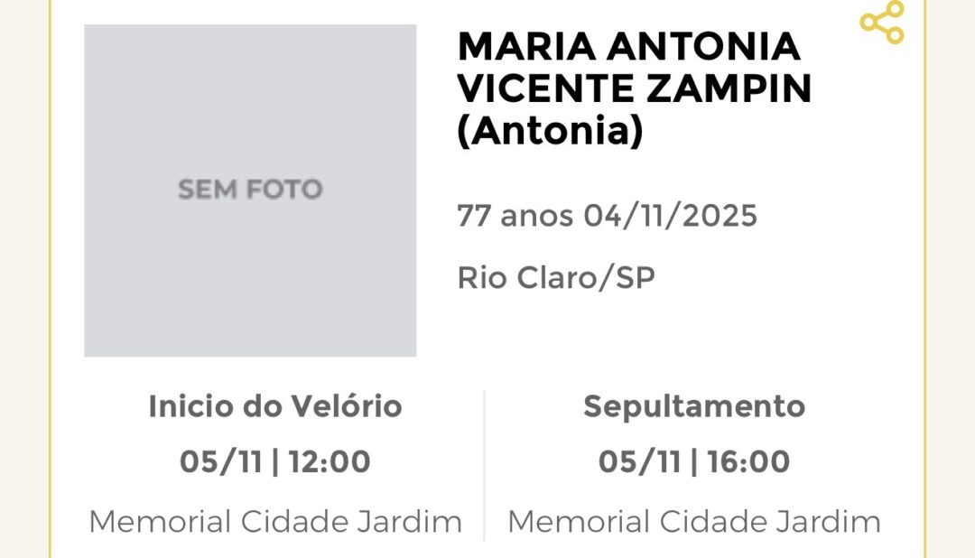 Sepultamento dia 05 as 16:00 hs., saindo o féretro do velório MEMORIAL CIDADE JARDIM, na cidade de Rio Claro para o cemitério MEMORIAL CIDADE JARDIM, na cidade de Rio Claro.