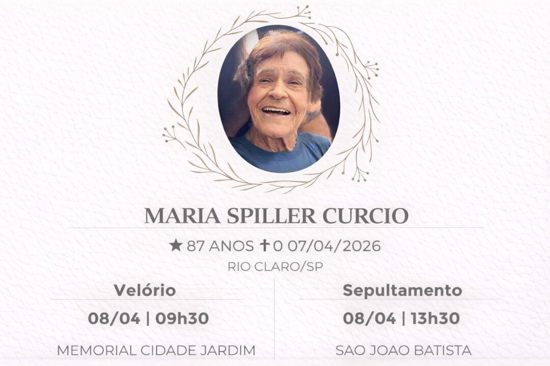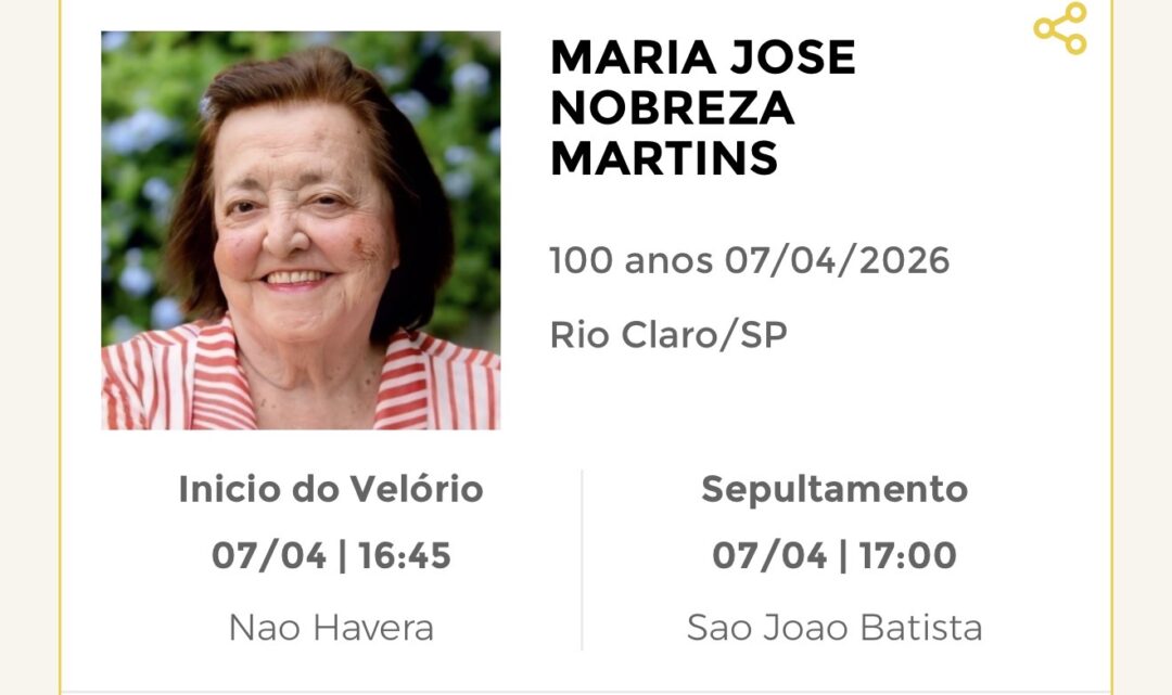 Sepultamento dia 07 as 17:00 hs., saindo o féretro do velório NÃO HAVERÁ, na cidade de Rio Claro para o cemitério SÃO JOÃO BATISTA, na cidade de Rio Claro.