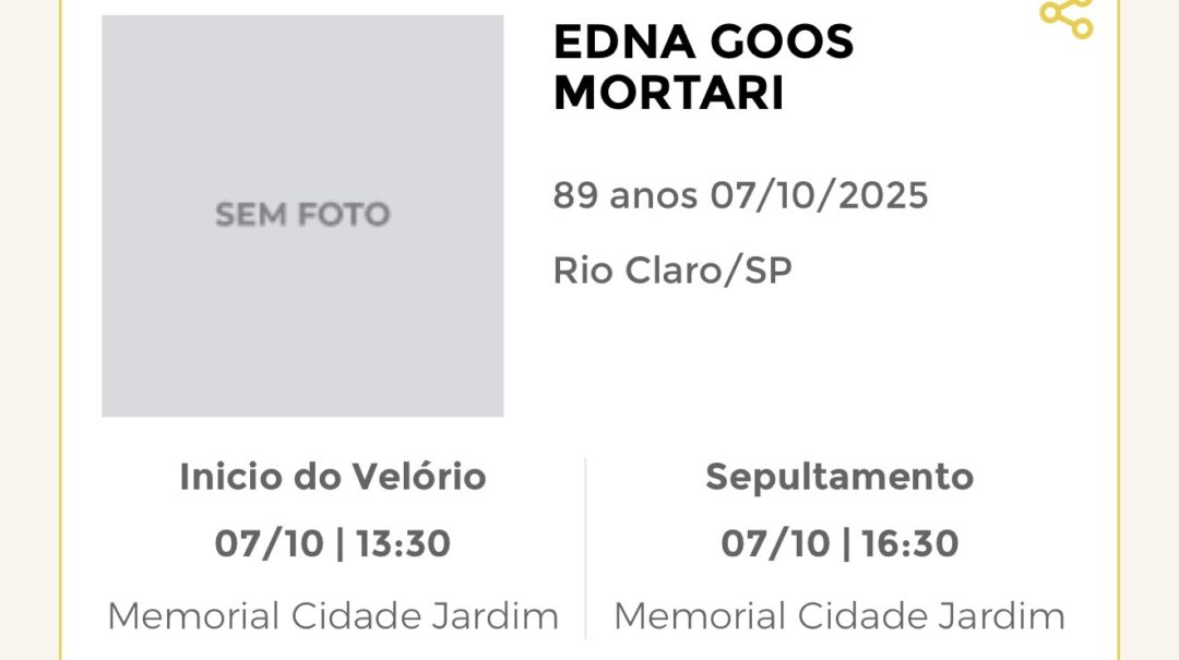 Sepultamento dia 7 as 16:30 hs., saindo o féretro do velório MEMORIAL CIDADE JARDIM, na cidade de Rio Claro para o cemitério MEMORIAL CIDADE JARDIM, na cidade de Rio Claro.
