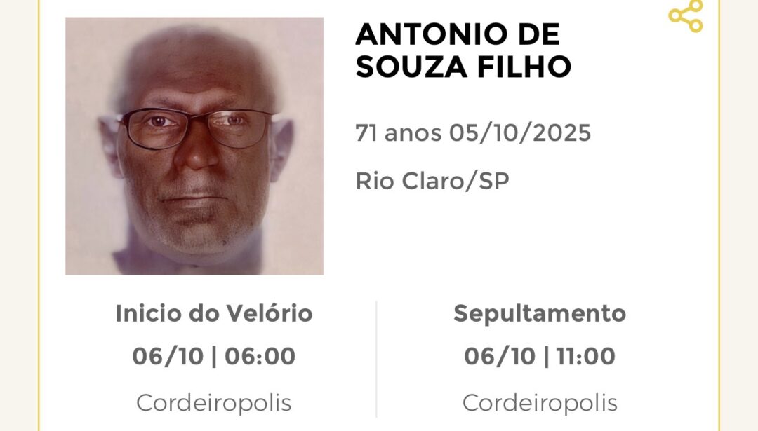 Sepultamento dia 05 as 14:30 hs., saindo o féretro do velório NÃO HAVERÁ, na cidade de Rio Claro para o cemitério MEMORIAL CIDADE JARDIM, na cidade de Rio Claro.