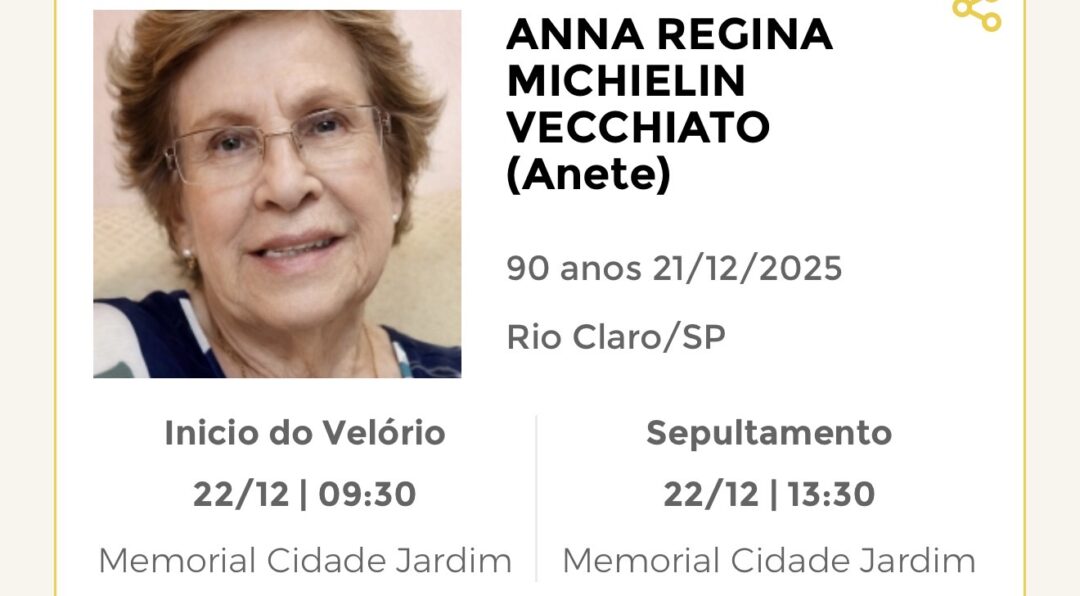 Sepultamento dia 22 as 16:00 hs., saindo o féretro do velório MEMORIAL CIDADE JARDIM, na cidade de Rio Claro para o cemitério MEMORIAL CIDADE JARDIM, na cidade de Rio Claro.