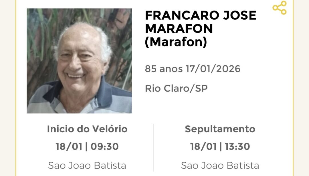 Sepultamento dia 18 as 17:00 hs., saindo o féretro do velório SÃO JOÃO BATISTA, na cidade de Rio Claro para o cemitério SÃO JOÃO BATISTA, na cidade de Rio Claro.