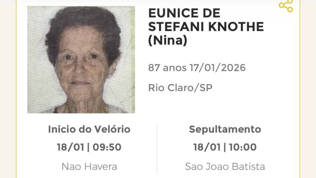 Sepultamento dia 18 as 13:30 hs., saindo o féretro do velório SÃO JOÃO BATISTA, na cidade de Rio Claro para o cemitério SÃO JOÃO BATISTA, na cidade de Rio Claro.