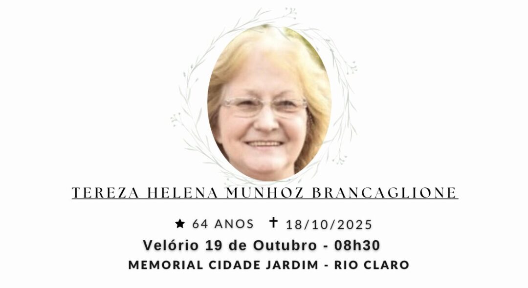 Sepultamento dia 19 as 12:00 hs., saindo o féretro do velório MEMORIAL CIDADE JARDIM, na cidade de Rio Claro para o cemitério CORUMBATAÍ, na cidade de Corumbataí.