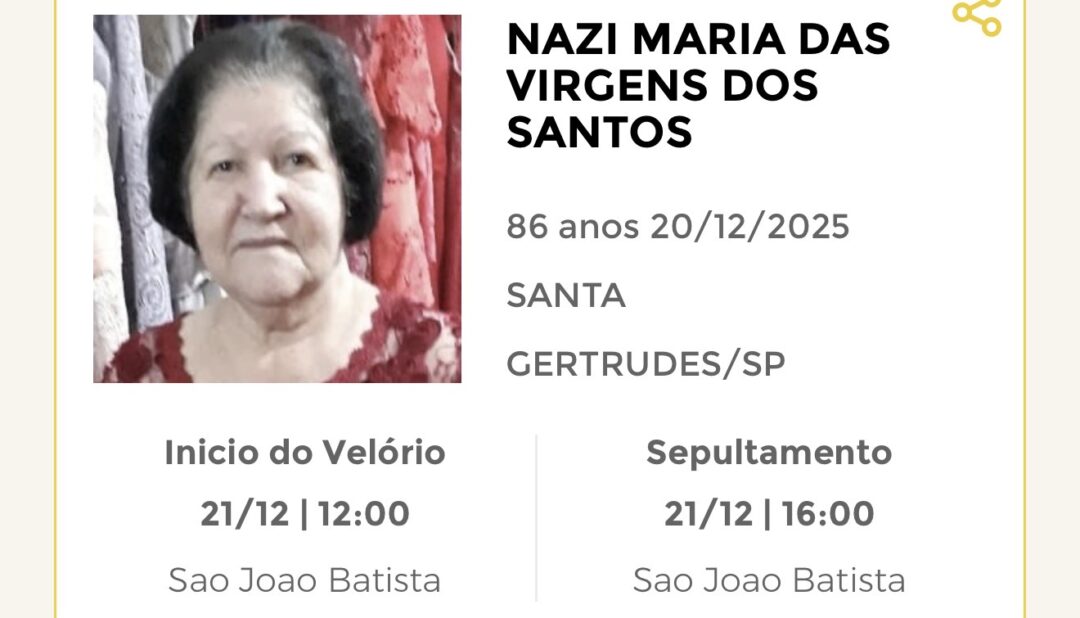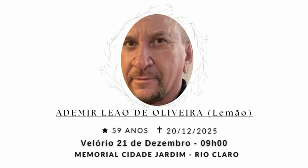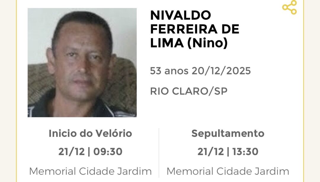 Sepultamento dia 21 as 10:30 hs., saindo o féretro do velório MEMORIAL CIDADE JARDIM, na cidade de Rio Claro para o cemitério CREMATÓRIO MEM.CID.JARDIM, na cidade de Rio Claro.
