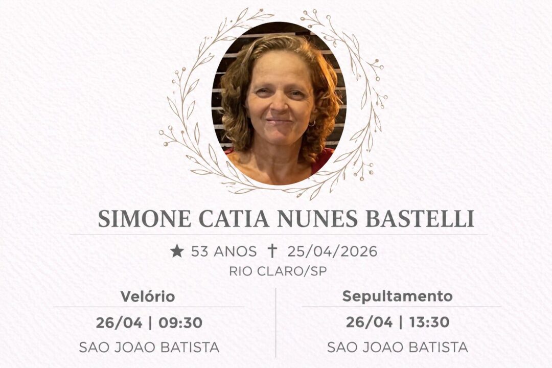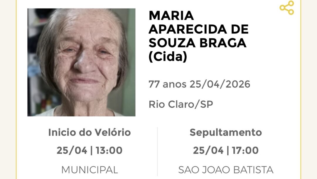 Sepultamento dia 26 as 13:30 hs., saindo o féretro do velório SÃO JOÃO BATISTA, na cidade de Rio Claro para o cemitério SÃO JOÃO BATISTA, na cidade de Rio Claro.
