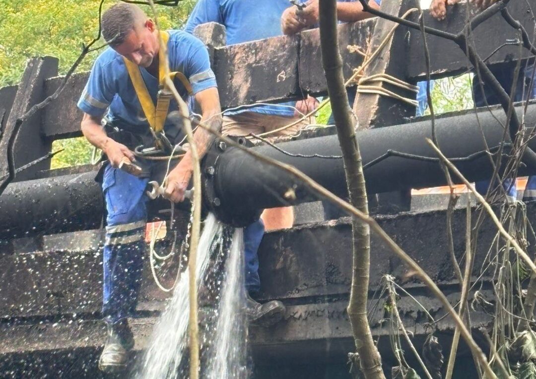 Trabalho foi de alta complexidade por conta da localização da adutora e foi finalizado por volta das 17h desta segunda-feira (27). Abastecimento aos bairros afetados, Bom Sucesso, Bom Retiro e Novo Wenzel deve ser normalizado durante a noite desta segunda.
