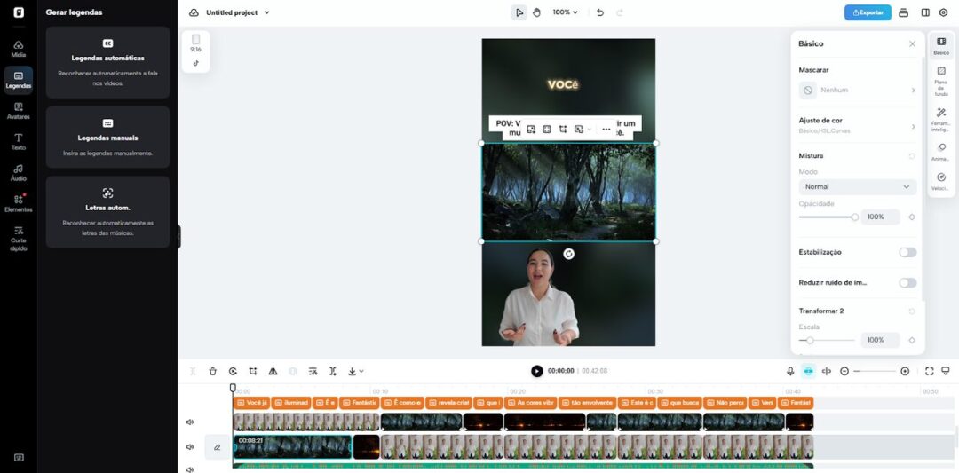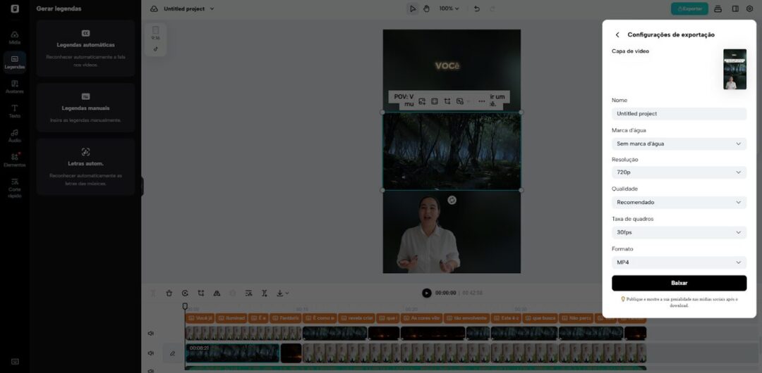 Quando o vídeo aprimorado carregar, ajuste legendas, adicione texto, personalize tamanho, cor e alinhamento. Aplique filtros, efeitos, música de fundo ou remova o fundo.