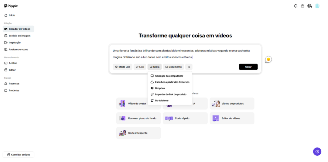 Acesse a plataforma e faça seu cadastro. Depois, vá até a aba “Gerador de vídeos”. Insira um comando de texto descrevendo como o vídeo escuro deve ficar após a melhoria. Você pode enviar mídias de referência para ajudar o sistema. Basta clicar em “Mídia” e subir arquivos de um dispositivo local, celular, Dropbox ou até via link. Caso prefira, escolha “Recursos” em vez disso. Quando estiver tudo pronto, selecione “Gerar”.