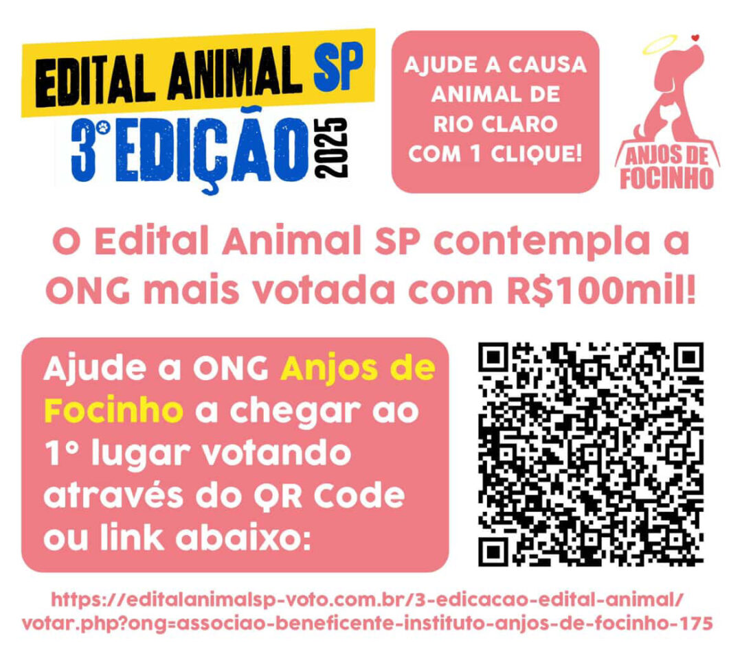 A Anjos de Focinho é a única ONG da causa animal reconhecida como utilidade pública municipal em Rio Claro, e mantém seu trabalho por meio de doações e voluntariado. “Precisamos muito do apoio da comunidade. Cada voto é fundamental para continuarmos salvando vidas e cuidando dos nossos anjos de quatro patas”, destaca a direção da entidade.