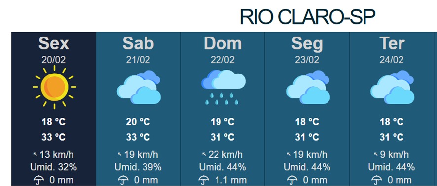 Entre sábado (21/02), domingo (22/02) e segunda-feira (23/02), o tempo em Rio Claro e nas demais regiões paulistas deve seguir com sol entre nuvens pela manhã e chuvas isoladas em pontos específicos.
