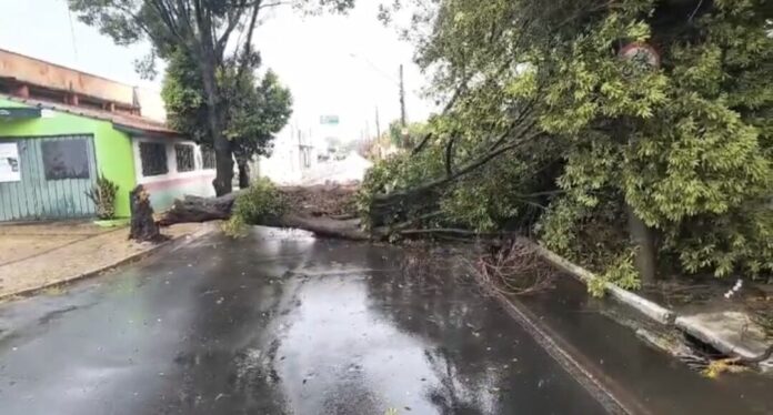 Uma queda de árvore provocada pela forte chuva registrada no final da tarde desta quinta-feira (5) interditou o trânsito na região da Vila Indaiá, em Rio Claro (SP).