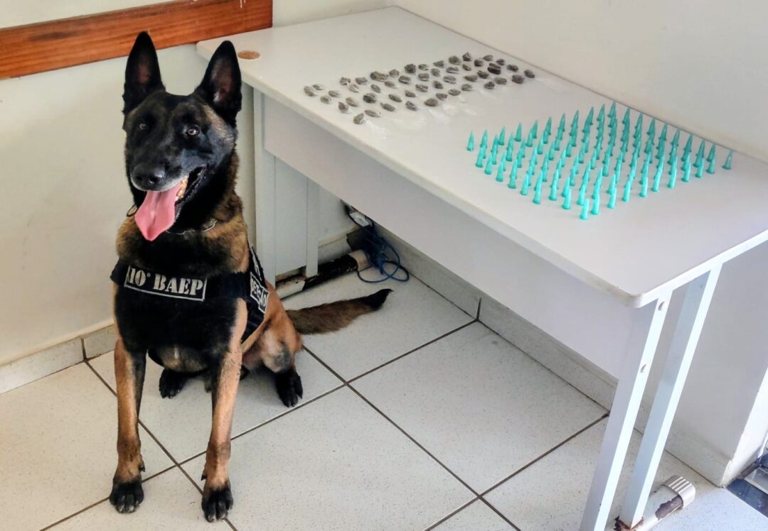 Após a abordagem, os policiais fizeram varredura com o cão de faro Blaster pelo trajeto percorrido pelos suspeitos durante a fuga. O animal indicou pontos com odor característico, onde foram encontradas mais porções de maconha e cocaína.