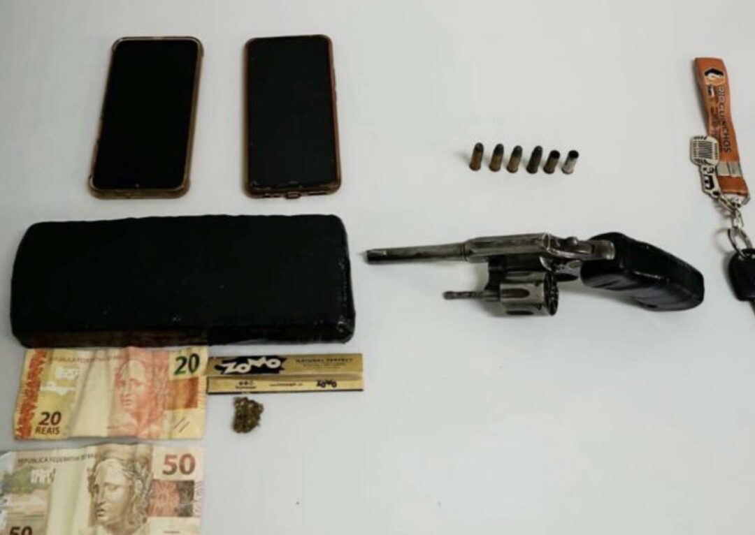 Na sequência, foi realizada a vistoria no veículo, onde os policiais localizaram uma porção de maconha e um revólver calibre .32, municiado, com seis munições, sendo duas deflagradas e quatro intactas. Questionados sobre o material, os ocupantes alegaram desconhecer a presença dos ilícitos no automóvel.