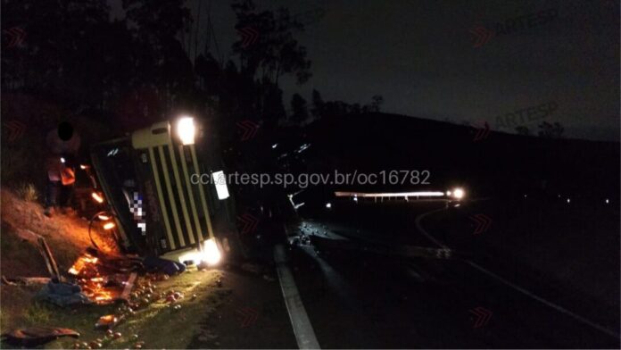 Um caminhão carregado com aproximadamente 12 toneladas de tomates tombou na noite desta quarta-feira (8) no km 21,7 da Rodovia Professor Zeferino Vaz (SP-083), em Campinas (SP). O acidente ocorreu por volta das 22h40 e causou a interdição total da alça de acesso no sentido sul, segundo informações da concessionária Rota das Bandeiras.