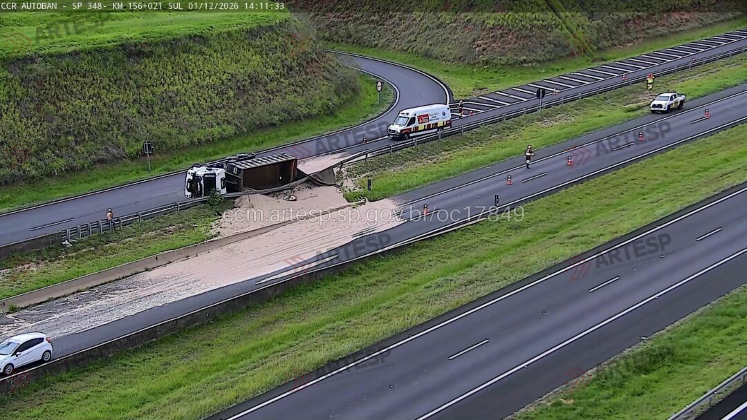 Um caminhão tombou na tarde desta segunda-feira (12), no trevo de acesso da rodovia SPD 156/348, em Limeira (SP), provocando derramamento de carga e interdição parcial da via. O acidente foi registrado por volta das 13h45, no km 0 do dispositivo, em trecho administrado pela concessionária Autoban.