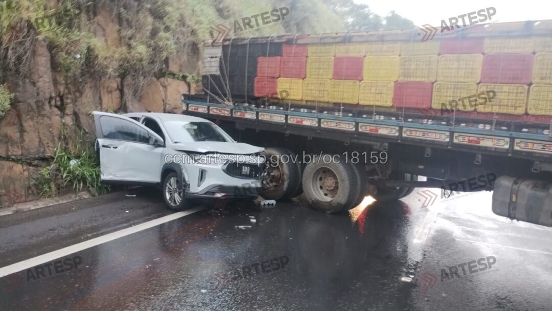 Após o impacto, o carro foi lançado contra a defensa metálica, rodou e parou no acostamento, ocupando parte da faixa 2. Já o caminhão ficou atravessado sobre as faixas de rolamento.