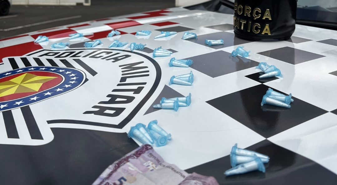 Na busca pessoal, foram encontrados 10 microtubos de cocaína e R$ 5 em dinheiro. Na sacola dispensada, os policiais localizaram mais 51 microtubos da mesma substância, totalizando 61 porções.