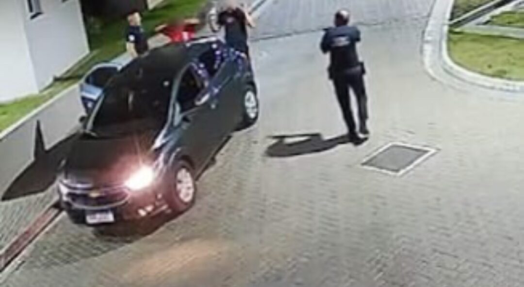 Segundo informações do solicitante, um Chevrolet Ônix com placa adulterada — uma das letras coberta com fita adesiva preta — estava na portaria do condomínio. Ao abordar o veículo que tentava sair do local, os agentes encontraram dois indivíduos em seu interior.