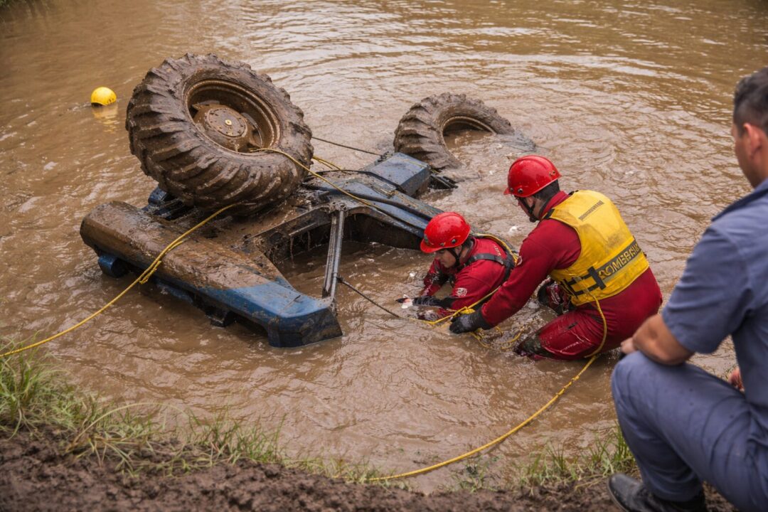 Após o acidente, o operador permaneceu dentro da cabine do trator, que ficou parcialmente submersa. De acordo com o registro policial, ele conseguiu manter contato com as equipes de resgate por rádio durante cerca de três horas.
