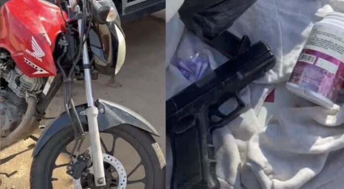 No trajeto da fuga, os policiais encontraram uma porção de droga dispensada pelo suspeito. Durante a abordagem, ele admitiu envolvimento no roubo de uma motocicleta em data anterior e indicou o local onde o veículo estava escondido, além de dois simulacros que teriam sido usados no crime.