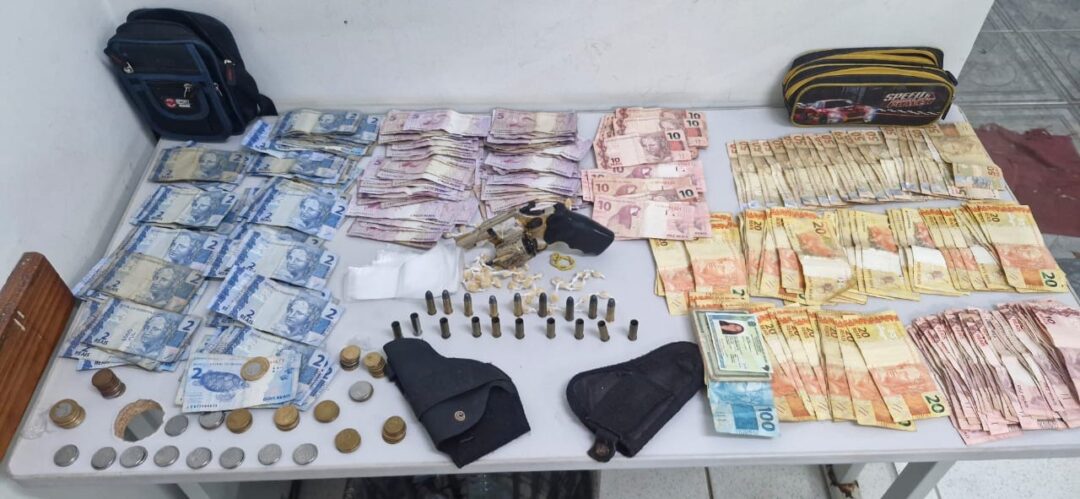 A ocorrência foi registrada como porte ilegal de arma de fogo e tráfico de drogas.